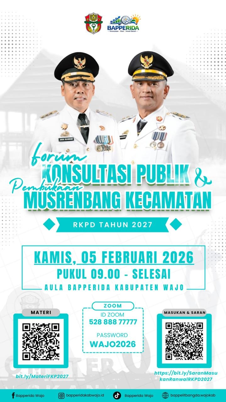WAJO - Bupati Wajo, Andi Rosman didampingi Wakil Bupati Wajo dr Baso Rahmanuddin (DBR) buka forum Konsultasi Publik Penyusunan RKPD Kabupaten Wajo Tahun 2027 dan Pembukaan Musrembang RKPD Tahun 2027...